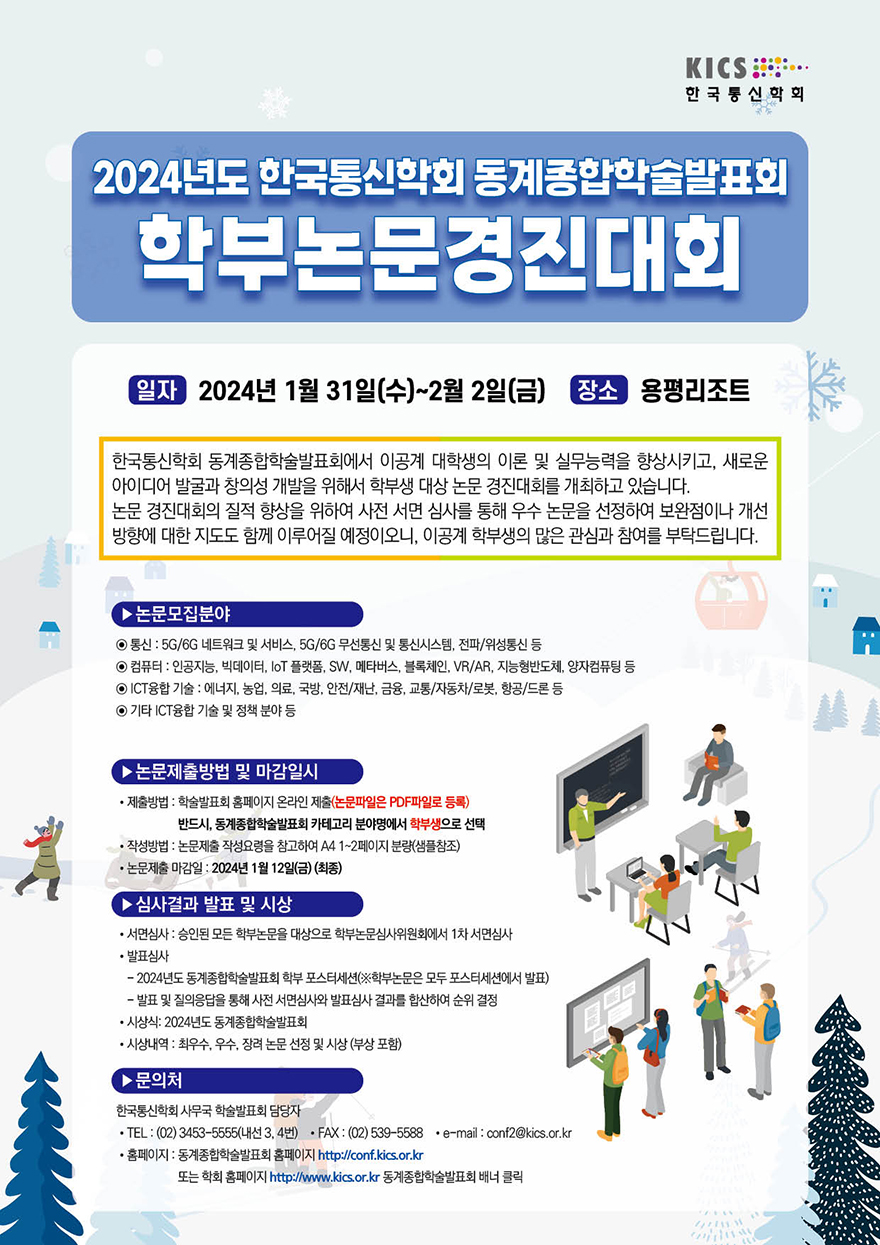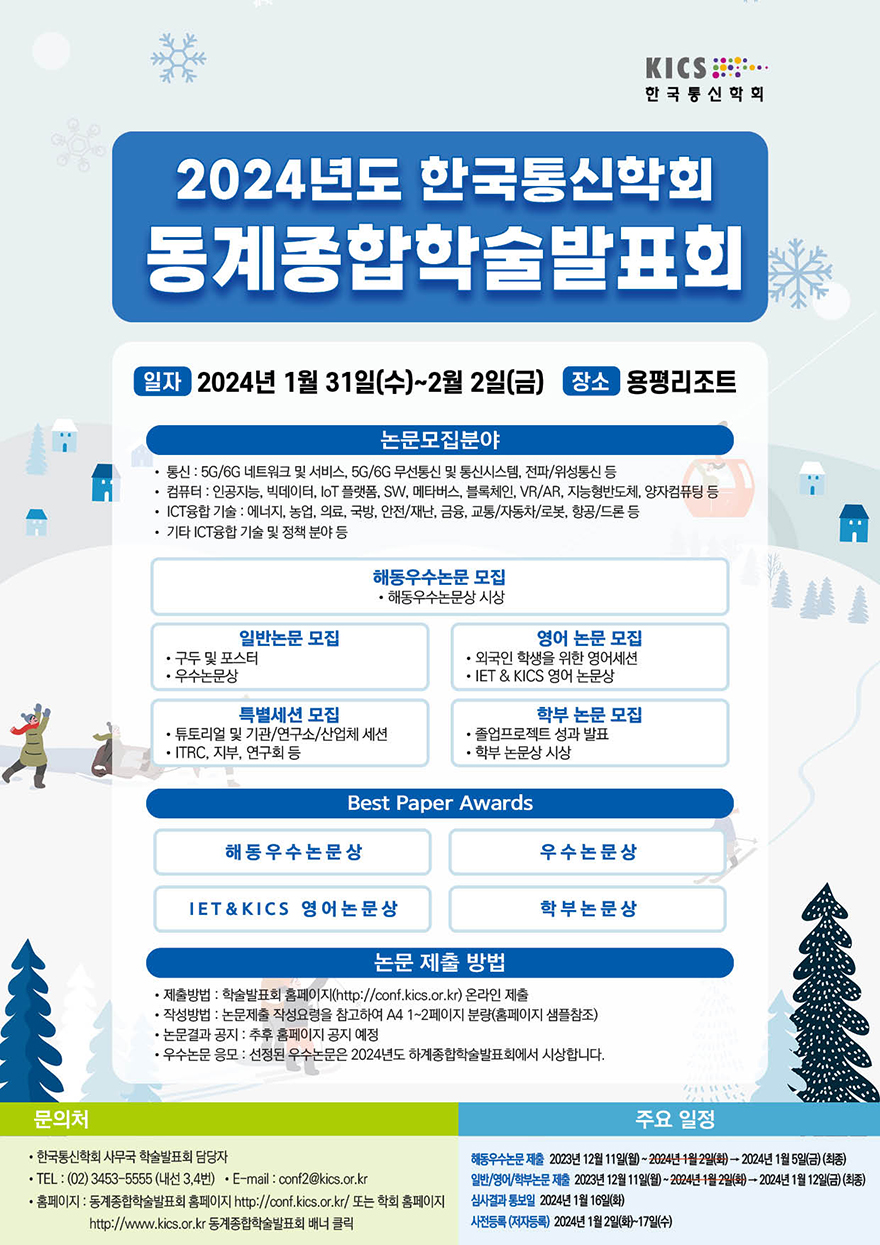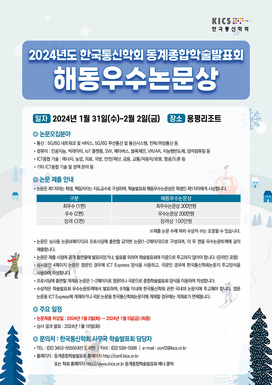 2024년도 동계종합학술발표회에서 논문발표 세션을 맡아 진행하실 좌장을 다음과 같이 공모하오니, 우리 학회 학술활동에 관심을 갖고 계신 회원 여러분의 많은 참여 바랍니다.