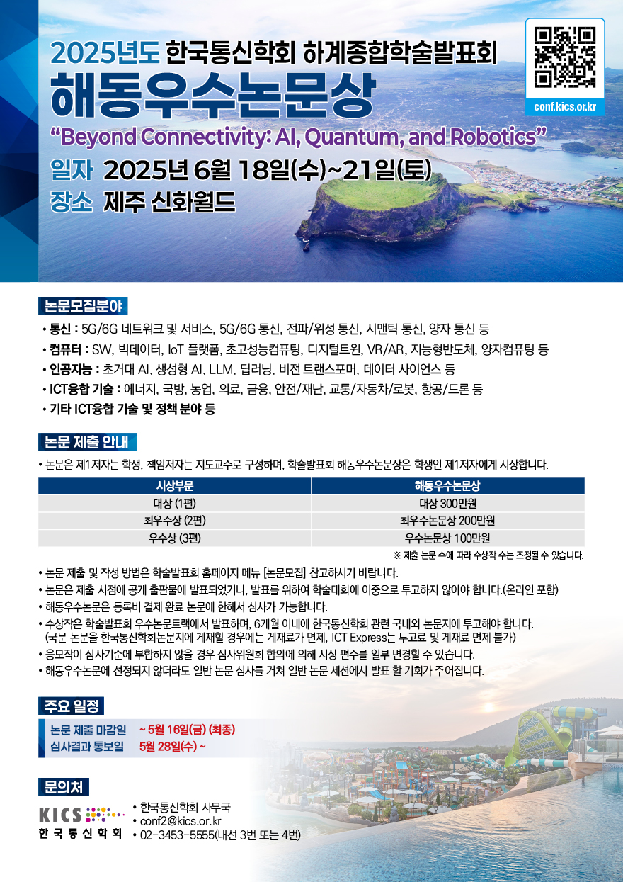 2025년도 하계종합학술발표회 에서 논문발표 세션을 맡아 진행하실 좌장을 다음과 같이 공모하오니, 우리 학회 학술활동에 관심을 갖고 계신 회원 여러분의 많은 참여 바랍니다.