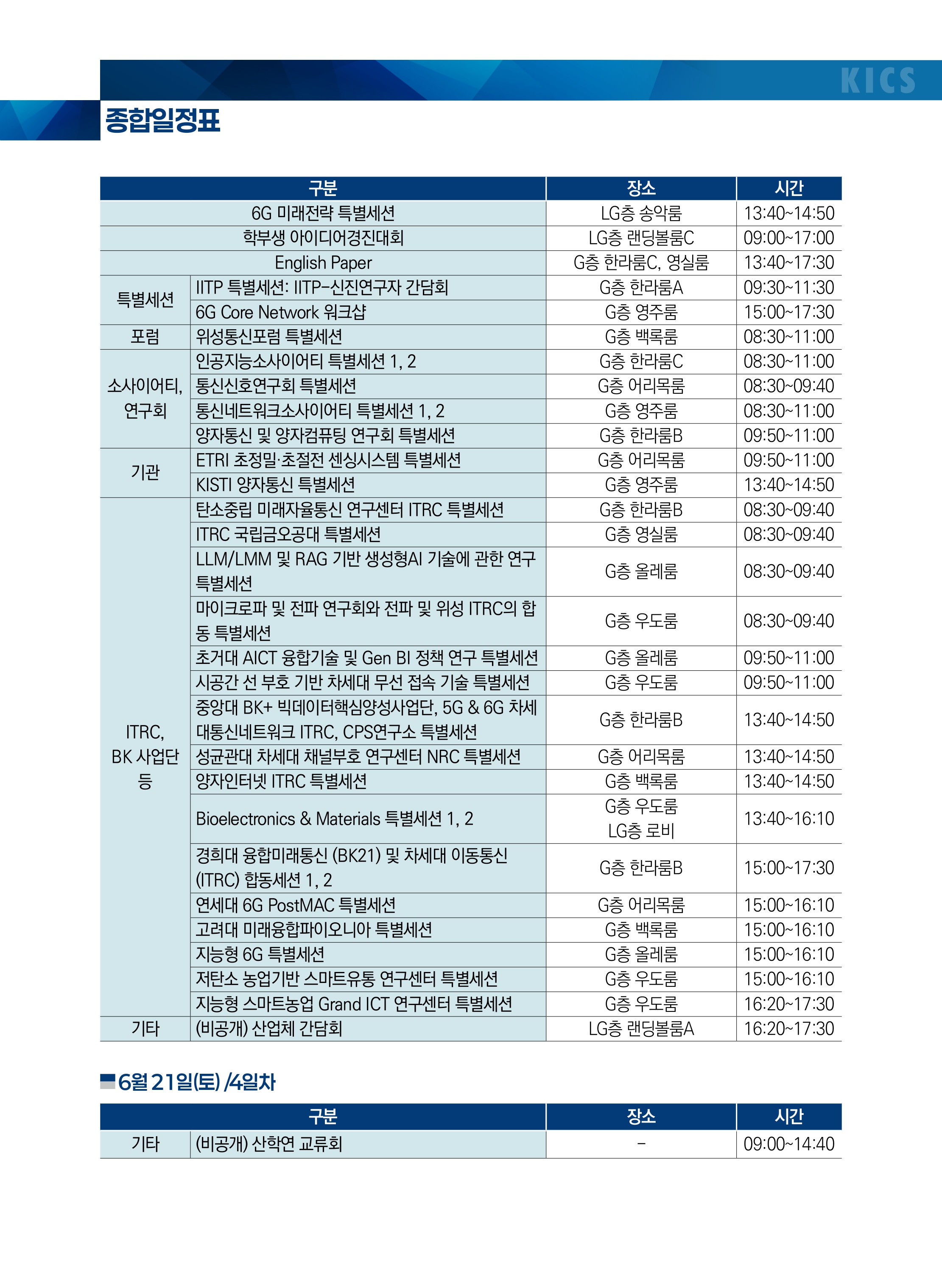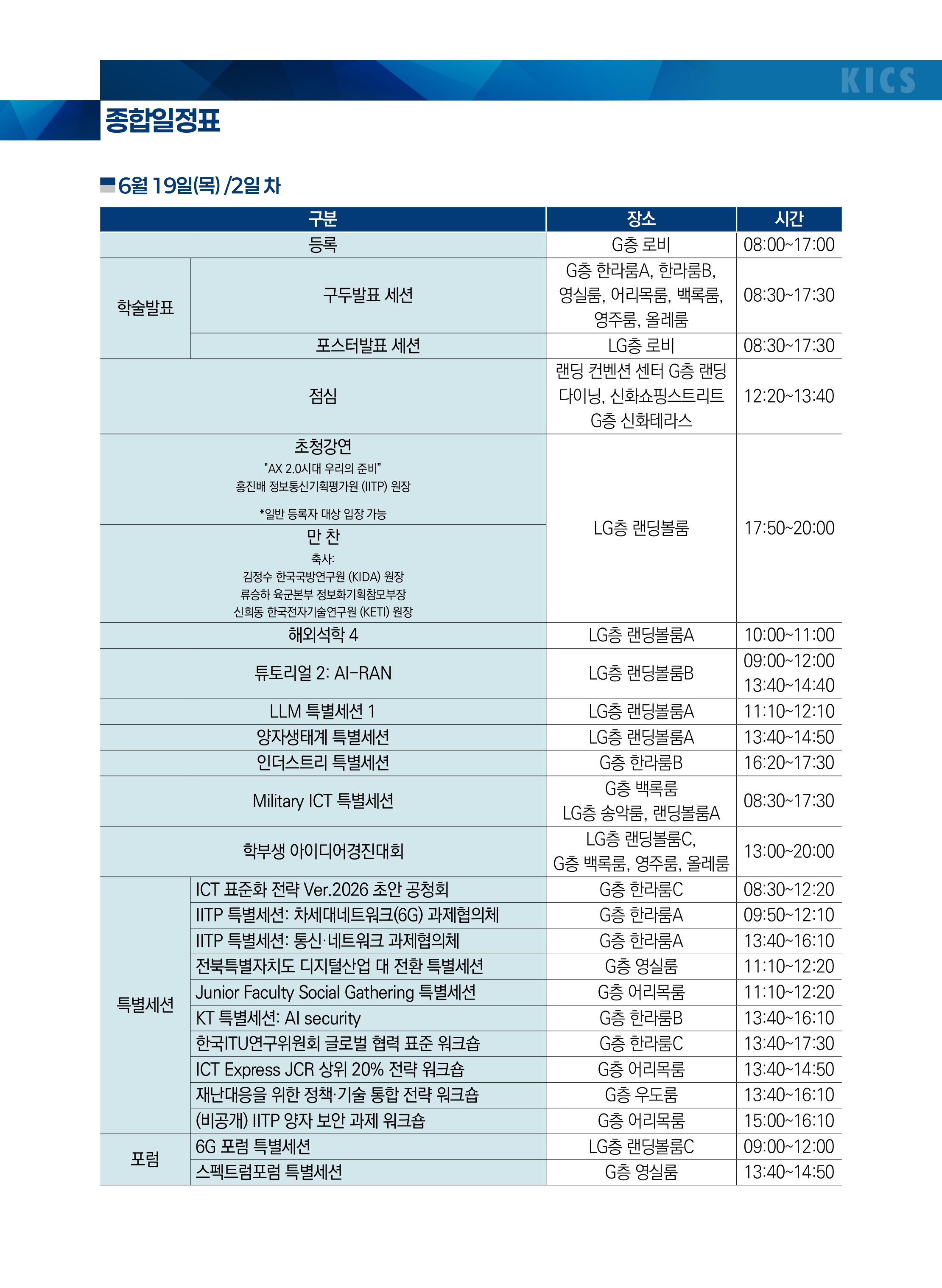 이외에도 6G 기술 및 미래 통신 기술, AI-RAN, 위성통신, 양자컴퓨팅 및 양자통신, 로봇, AI, LLM, 바이오 등 다양한 분야 간 융합연구를 조명할 수 있는 특별세션이 마련되어 있으며, 또한 학술발표회 둘째 날인 19일 목요일에 군·산·학·연 연구자 및 개발자들이 참석하여 국방 ICT 기술의 현재와 미래를 논의하는 "Military ICT Day"가 전일 행사로 개최됩니다.