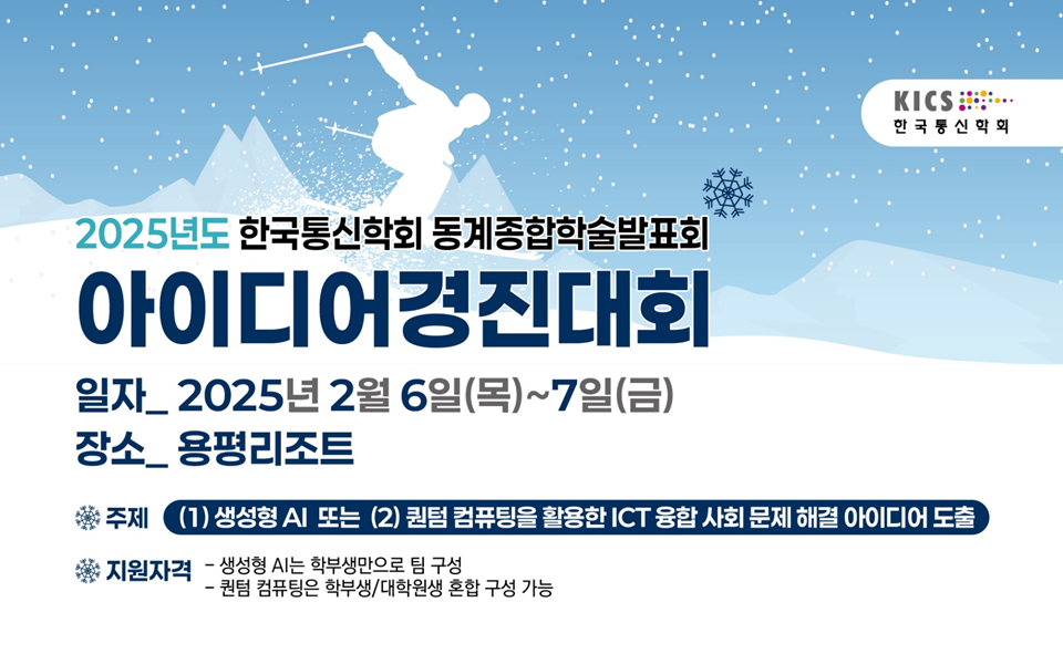 안녕하세요. 한국통신학회 사무국입니다. 2025년도 동계종합학술발표회에서 아이디어경진대회를 개최하오니 학부생/대학원생 여러분의 많은 참여 부탁드립니다. * 아이디어경진대회(아이디어 발표)와 학부논문경진대회(논문 제출 및 발표O)는 서로 다른 행사 입니다.
