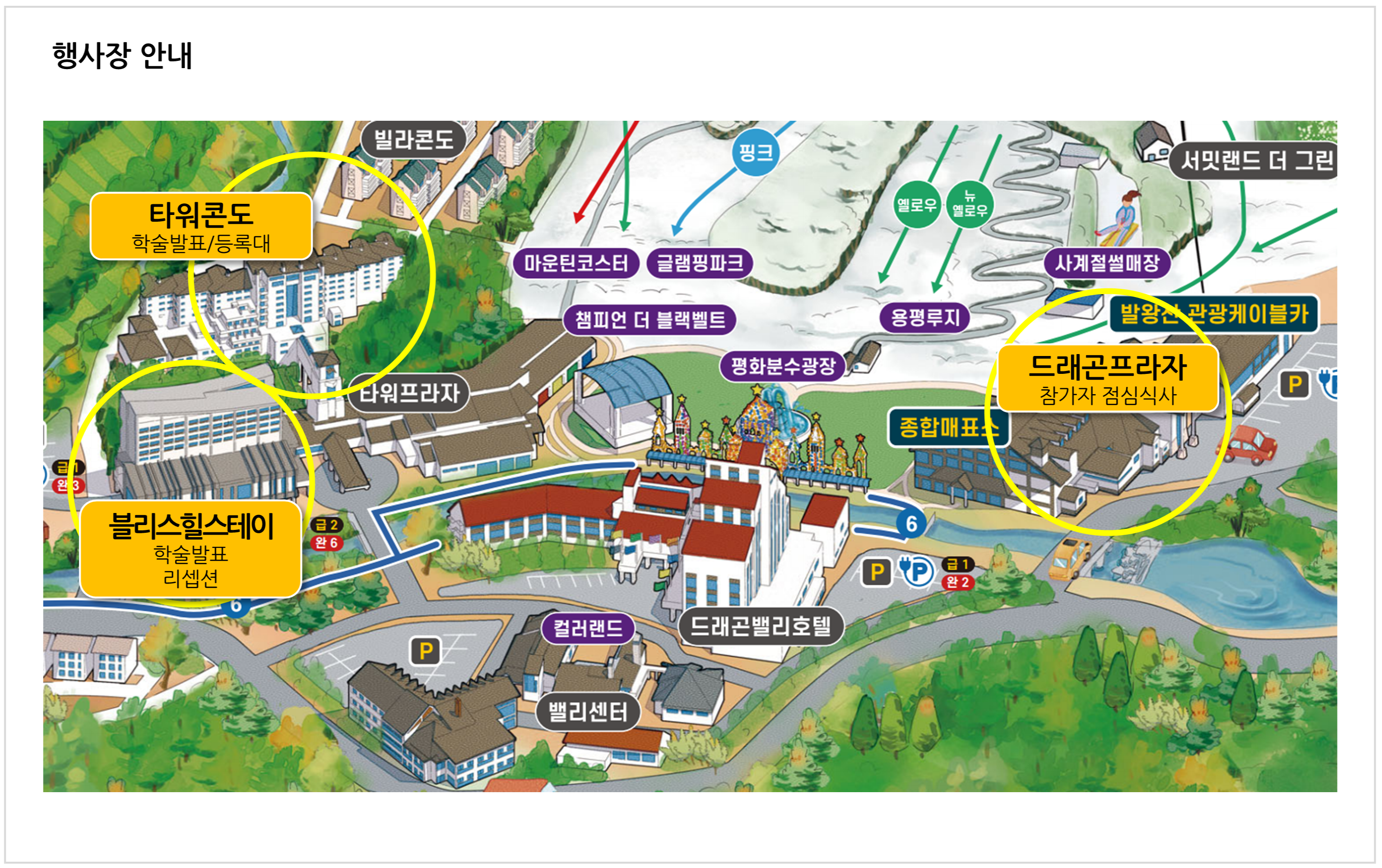숙박 예약 : 타워콘도(*행사장) / 빌라콘도 / 그린피아콘도 / 드래곤밸리호텔